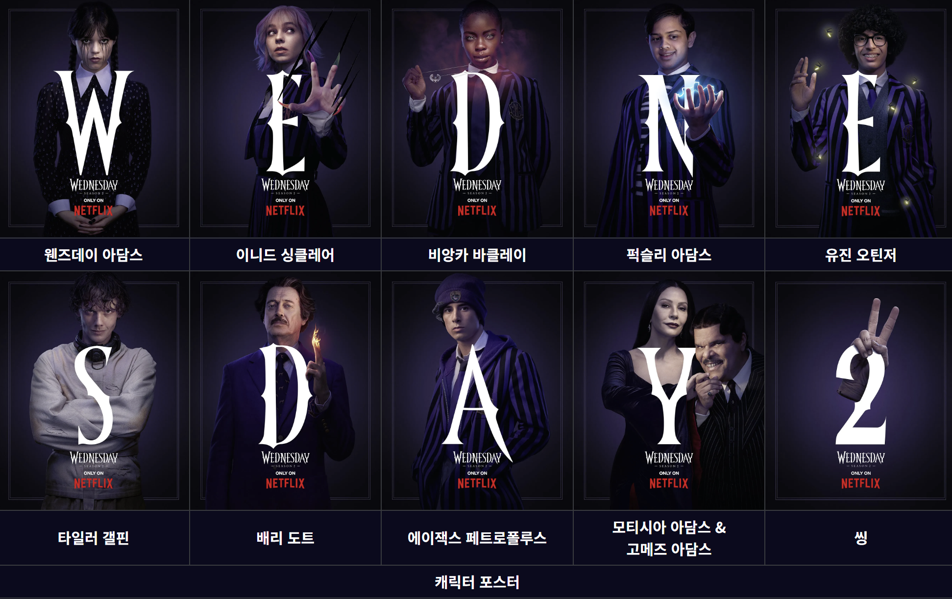 웬즈데이 시즌 1은 2022년 공개되어 팀 버튼 감독 특유의 어두운 미장센과 주인공 웬즈데이 아담스 역의 제나 오르테가의 강렬한 연기가 어우러져 17억 시간을 넘는 누적 시청 시간을 기록하며 전 세계적인 신드롬을 일으켰습니다.