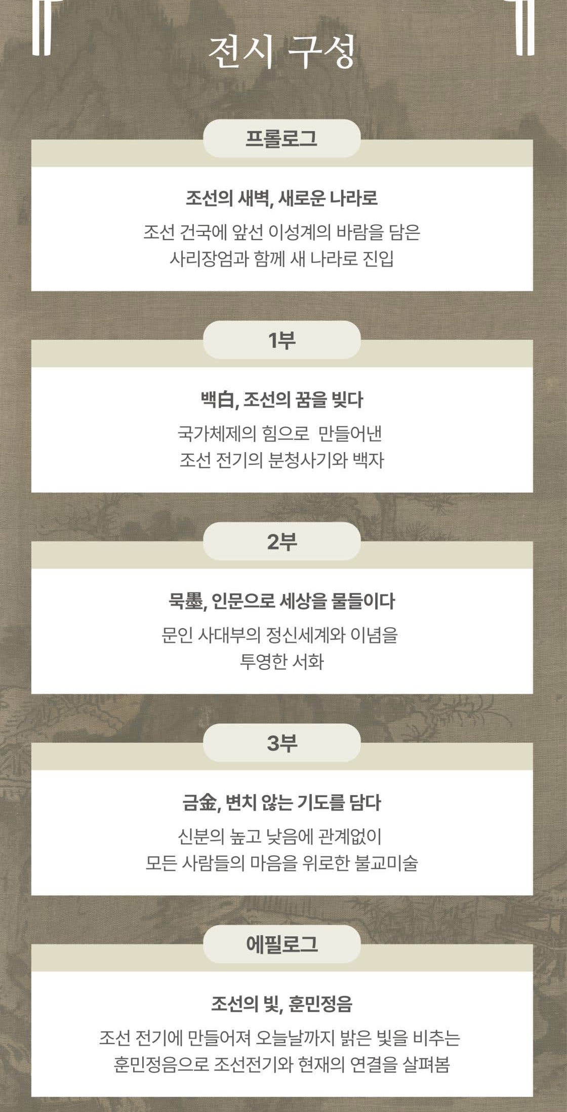 전시의 핵심 키워드는 백(白), 묵(墨), 금(金)으로, 조선 전기 미술을 관통하는 세 가지 색깔을 통해 시대의 미감을 이해할 수 있도록 구성되었습니다.
