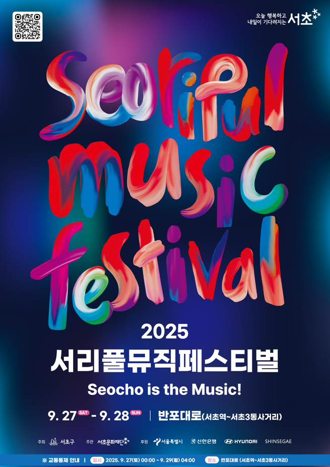 9월 27일-28일 양일간 반포대로에서 펼쳐지는 특별한 음악 축제, 2025 서리풀뮤직페스티벌에서 잊지 못할 추억을 만들어보시기 바랍니다!